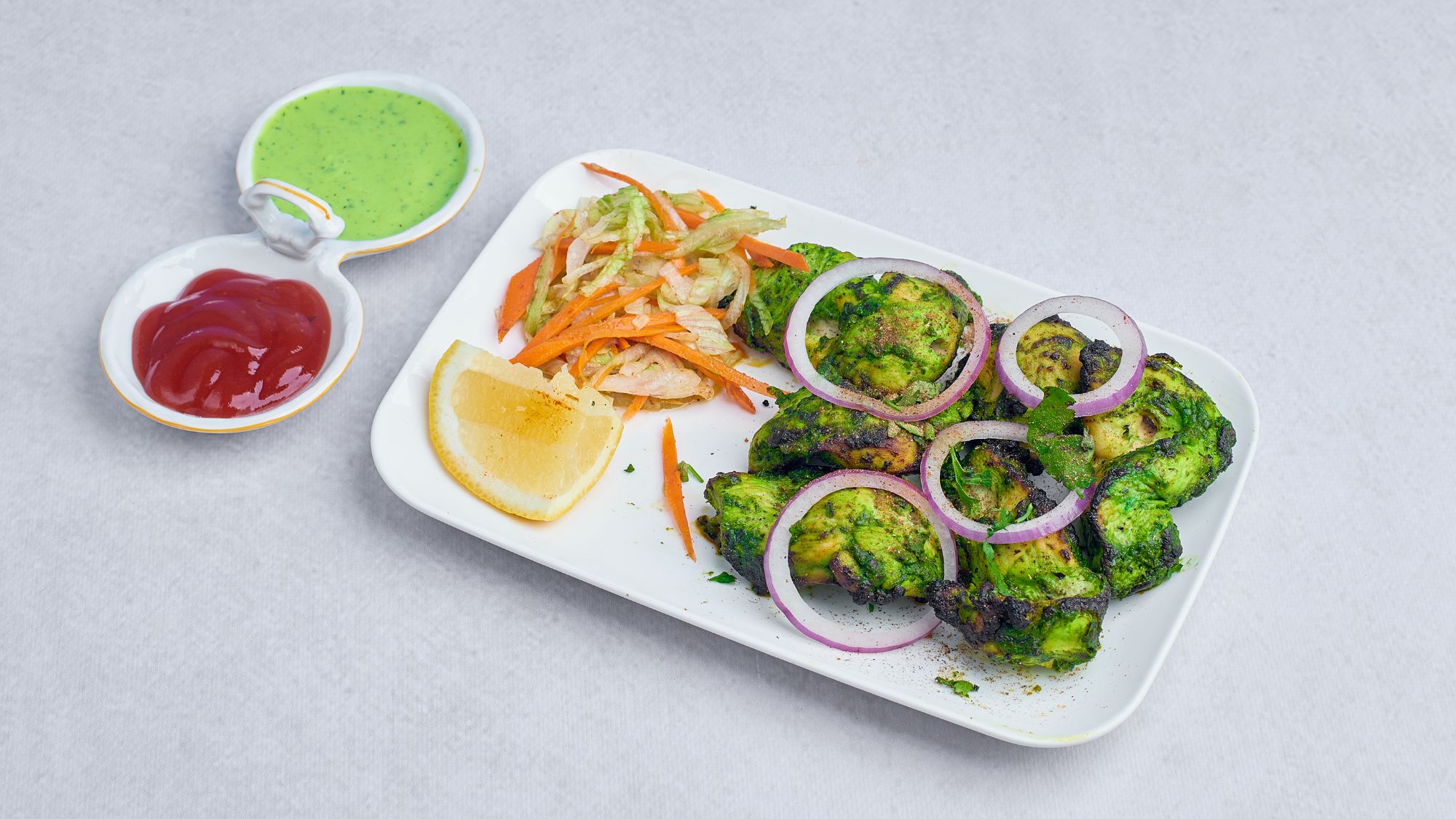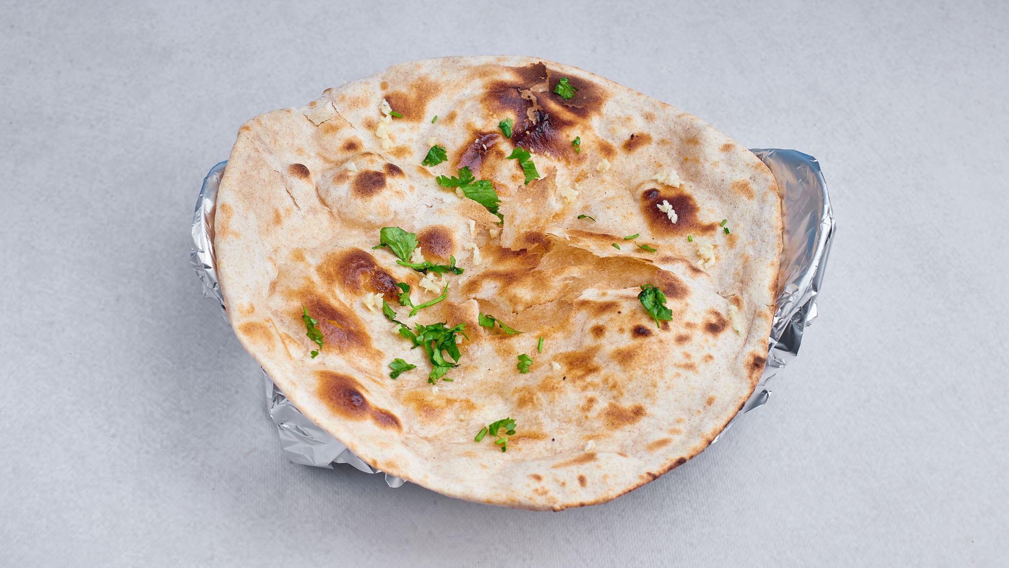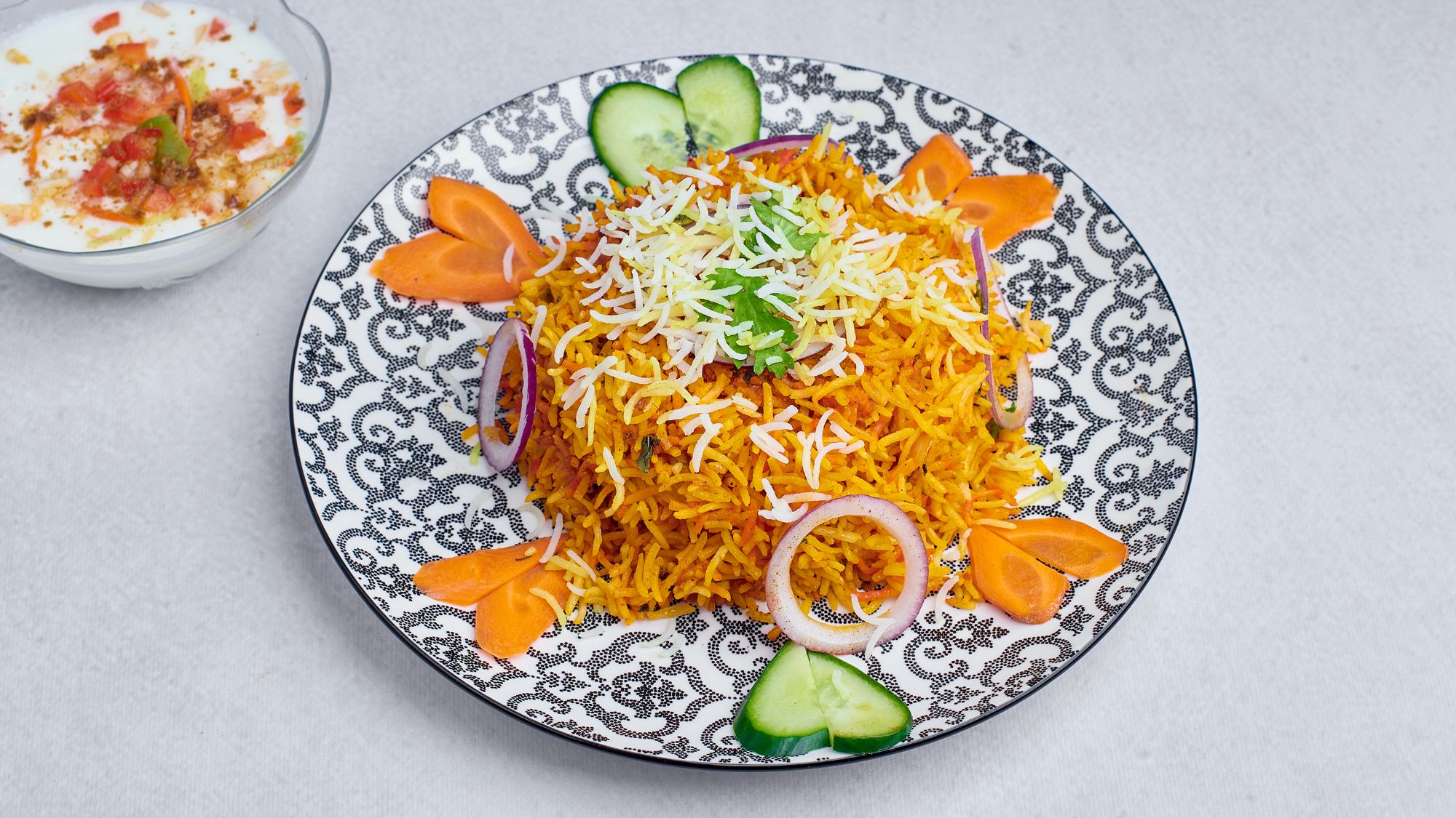 Lunch serwowan y jest z jednym naanem maślanym, pulao oraz świeżą sałatką warzywną. Do wyboru danie główne: wegetariańskie lub z kurczakiem.