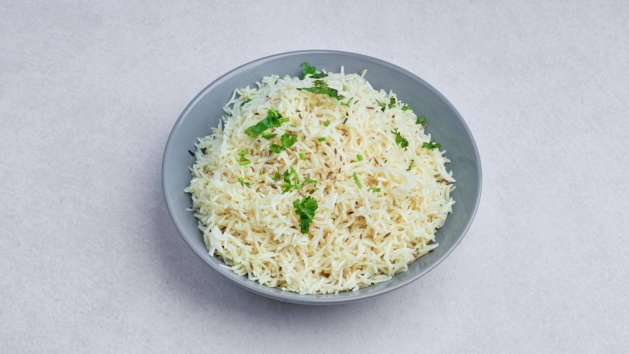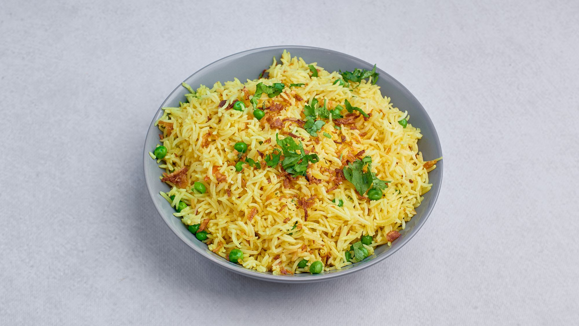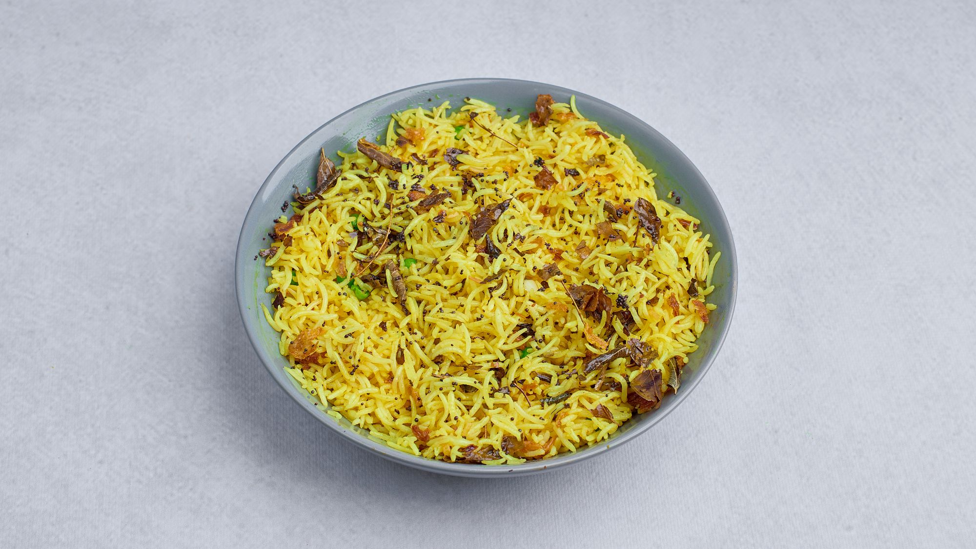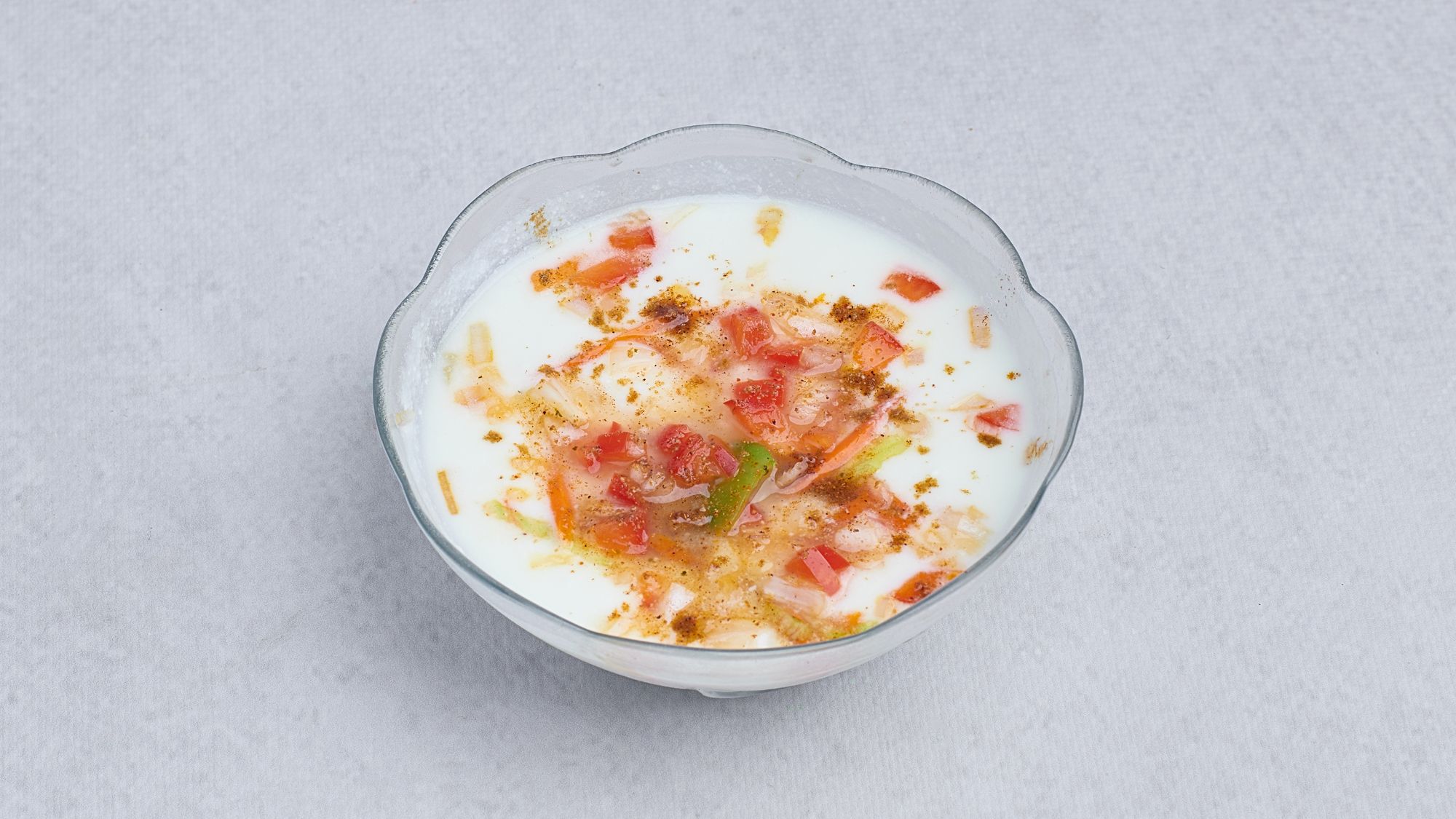 Lunch serwowan y jest z jednym naanem maślanym, pulao oraz świeżą sałatką warzywną. Do wyboru danie główne: wegetariańskie lub z kurczakiem.